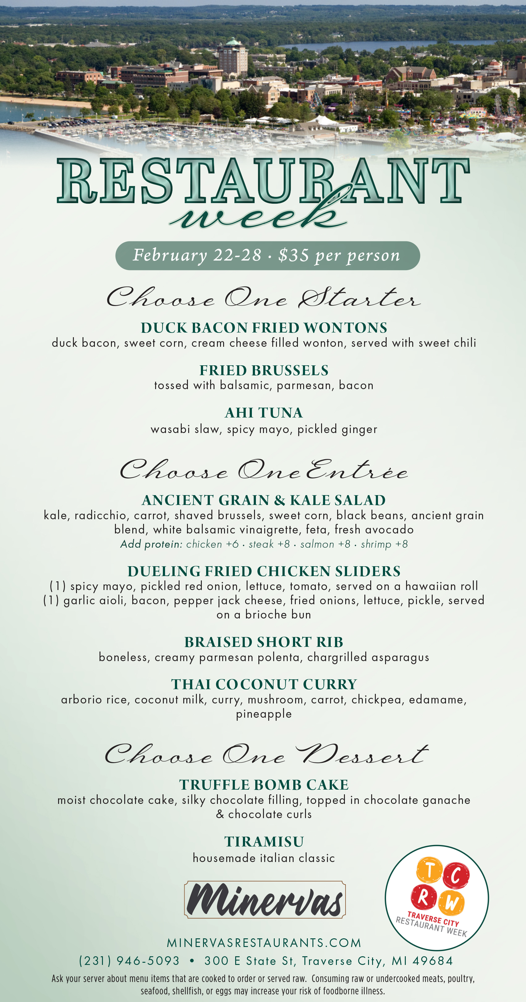 Enjoy a special Traverse City Restaurant Week menu at Minervas. Savor some delicious dishes in our comfortable downtown setting.